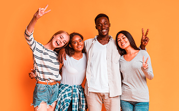 Carefree international students having fun over yellow background