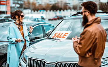 Man and woman choosing car to buy outdoors