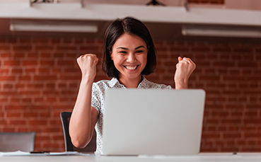 Overjoyed asian businesswoman winner celebrating online win looking at laptop
